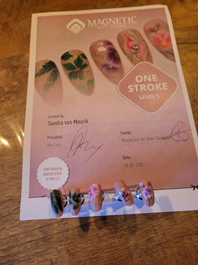Op zaterdag 18 oktober was het zover. Ik mocht naar Soesterberg om de cursus One stroke 1.0 te volgen. Onwijs leuk en leerzaam. En na de super leuke geslaagde dag, mocht ik een certificaat hiervoor in ontvangst nemen. Deze hangt al in mijn nagelsalon.